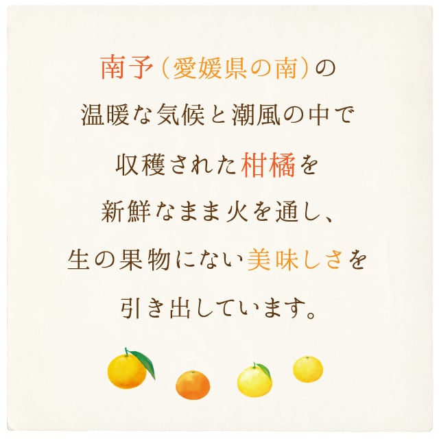 ニノズコンフィチュールは、愛媛県産のみかんや季節の果実を使った『手づくりのジャム』です。旬の果物を丁寧に手作りしているため、季節や果物の状態により、色・香り・糖度・粘度に個性があります。保存料・着色料・添加物を一切使用せず、ひと鍋ひと鍋、一瓶一瓶に気持ちを込めて手作りしています。柑橘で有名な愛媛県産のフルーツを使った手づくりコンフィチュールをお楽しみください。柑橘の国・愛媛から、日本全国へお届けします!